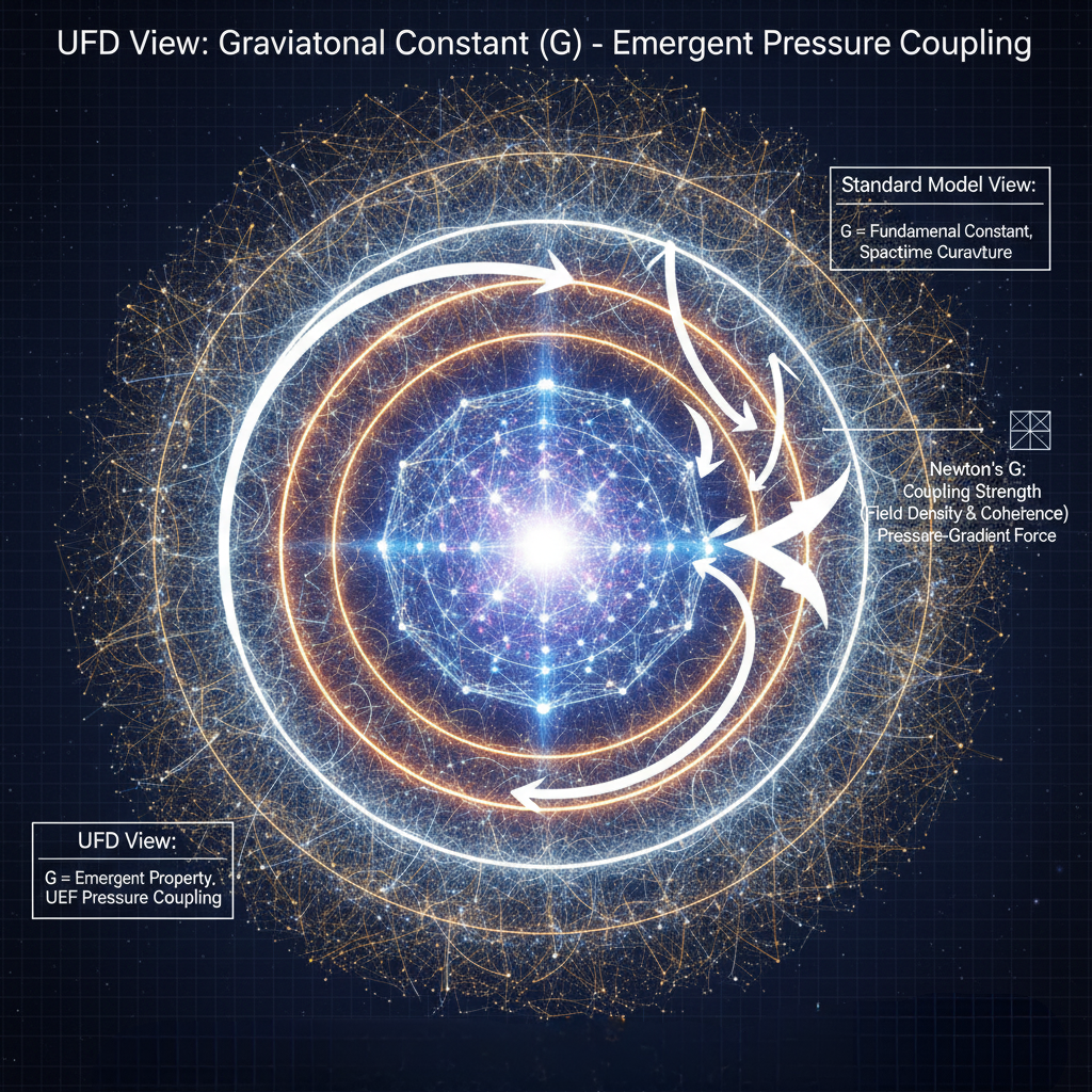 Gravity is not spacetime bending but a pressure effect within a universal energetic medium (the UEF). G reflects how strongly pressure differences in that medium pull coherent structures together. In this view, G is not a fundamental building block — it expresses how the underlying field behaves.