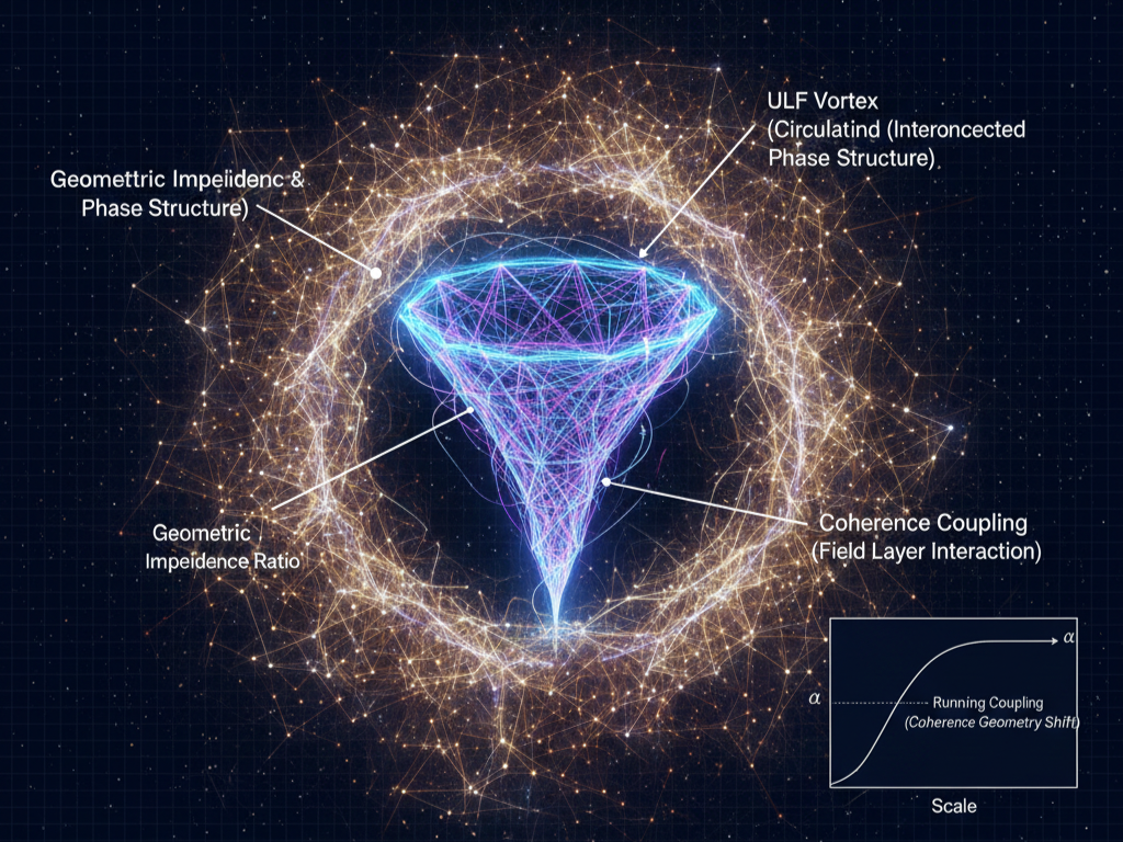 α reflects how efficiently circulating field structures (like electrons) interact with their surrounding field environment. Rather than being a basic “charge strength,” it measures how well two layers of reality couple to each other — like an impedance match in physics or engineering.