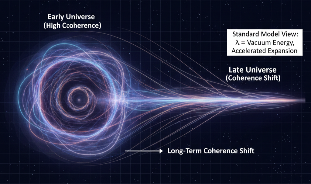 No vacuum energy term is required. What looks like cosmic acceleration is interpreted as a long-term shift in coherence between layers of the universal field.