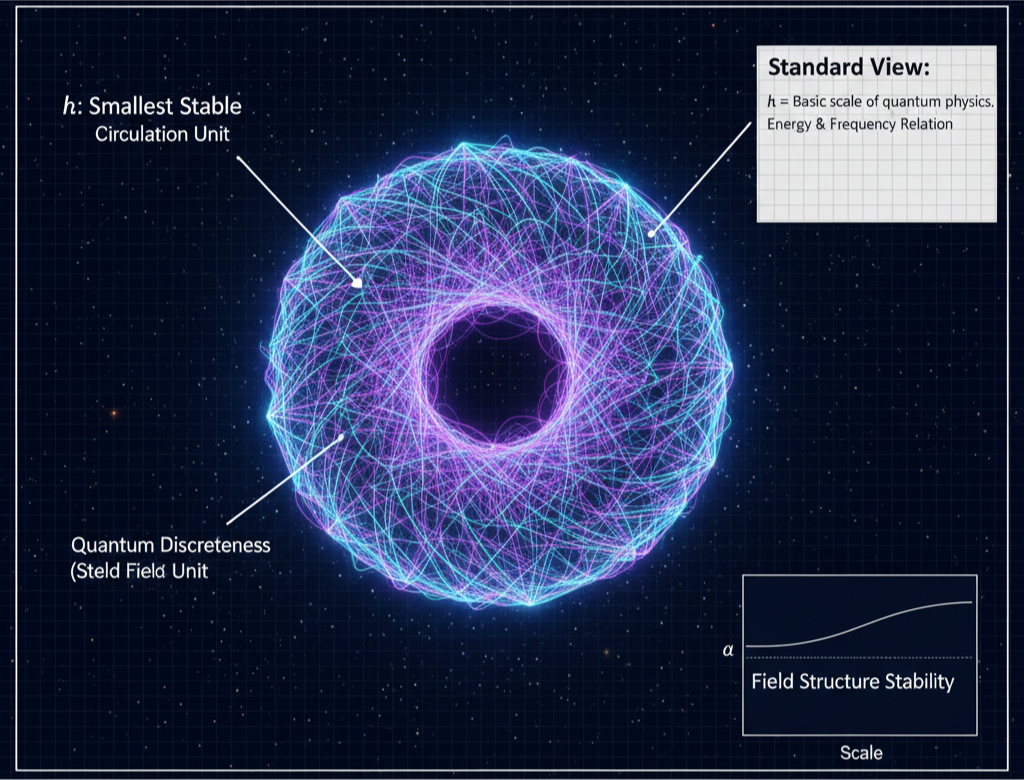 ħ reflects the smallest stable “circulation unit” in field structure. Quantum discreteness arises because field configurations can only form in certain stable patterns — not because reality is fundamentally random.