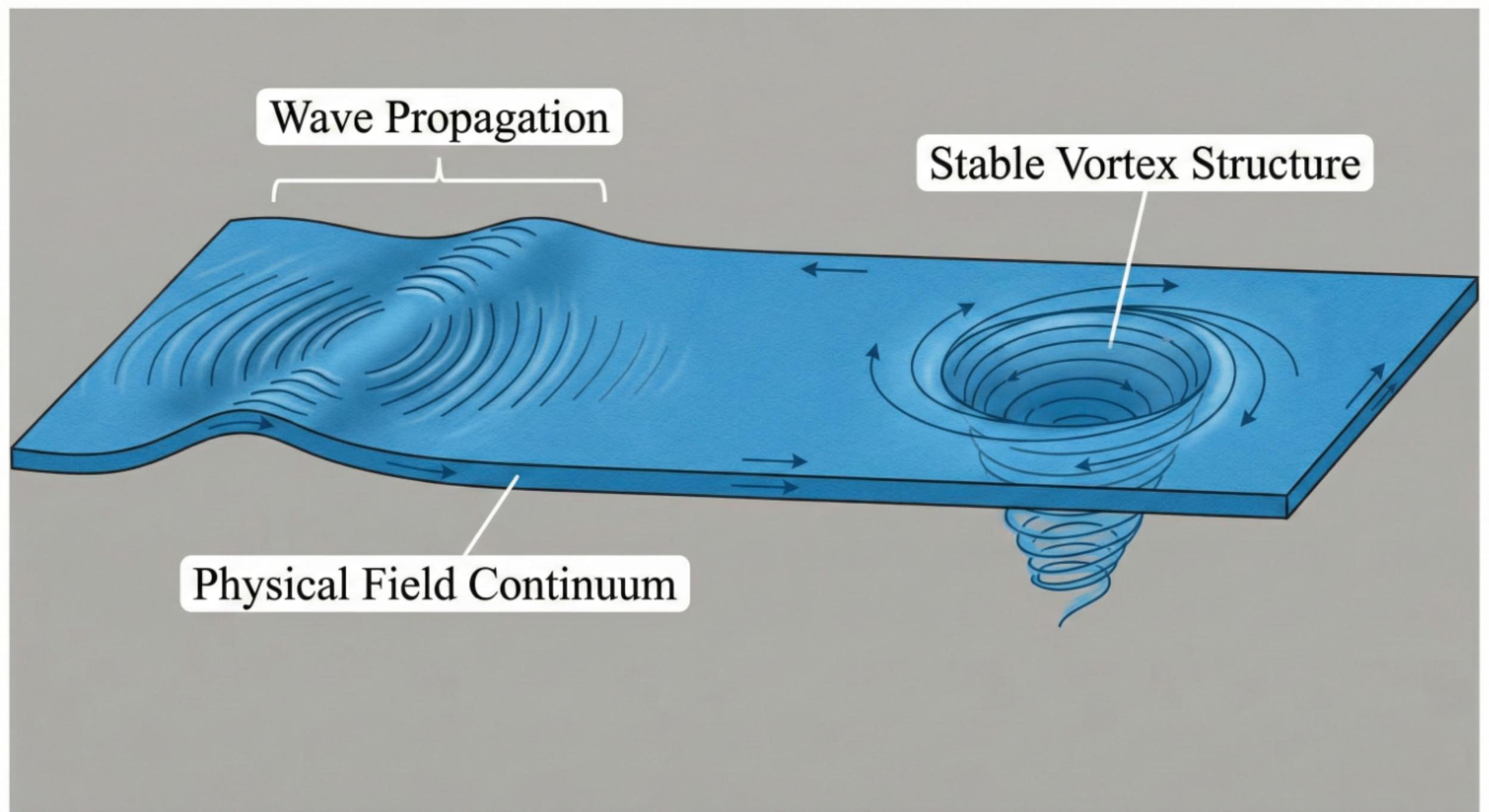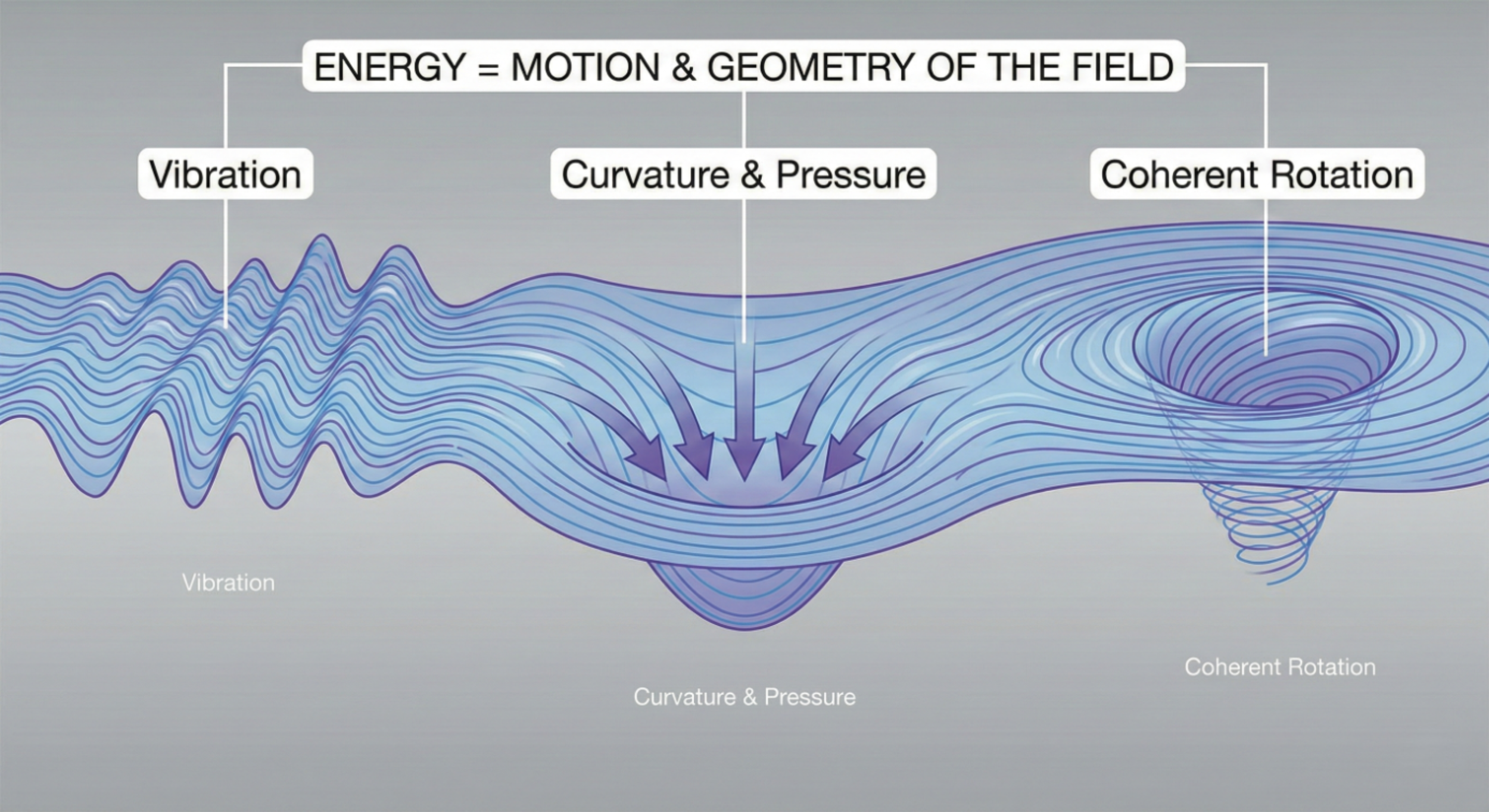 A field is not an assignment of numbers to points in space. It is a real, continuous substrate capable of supporting motion, tension, and coherence. Energy is not an abstract conserved quantity; it is the motion and geometric configuration of that substrate. Mass is not intrinsic substance; it is resistance to reconfiguration arising from stable circulation. Force is not action at a distance; it is the response of a medium to pressure gradients and geometric constraint.
