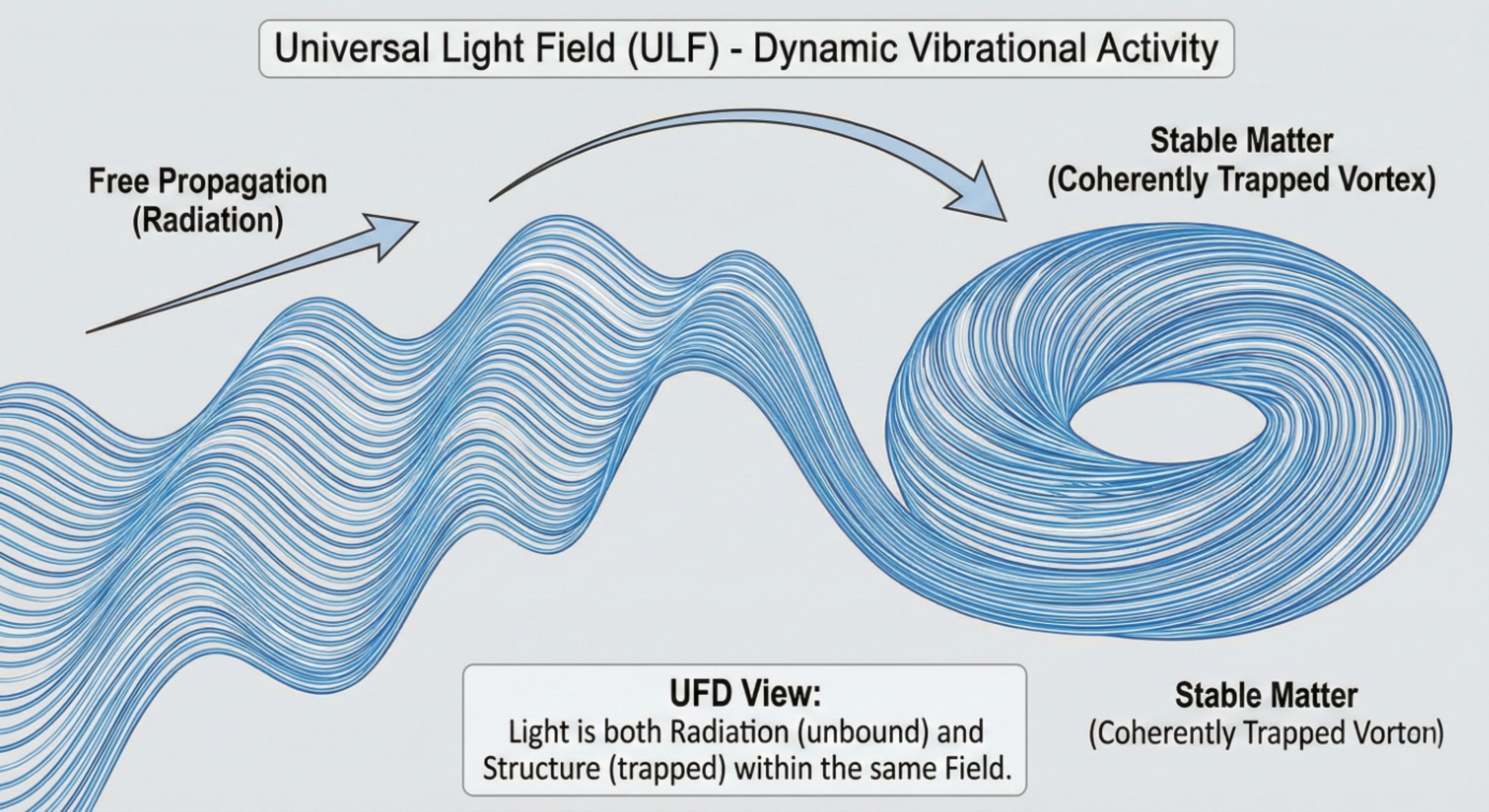 In UFD, light is the dynamic vibrational activity of the Universal Light Field (ULF). It is not merely a messenger between charged particles, but the coherent layer from which matter itself can form. When light circulates stably within the nested field structure, it becomes a vortex — and that vortex becomes a particle. Light is therefore both radiation and structure: free propagation when unbound, and stable matter when coherently trapped.