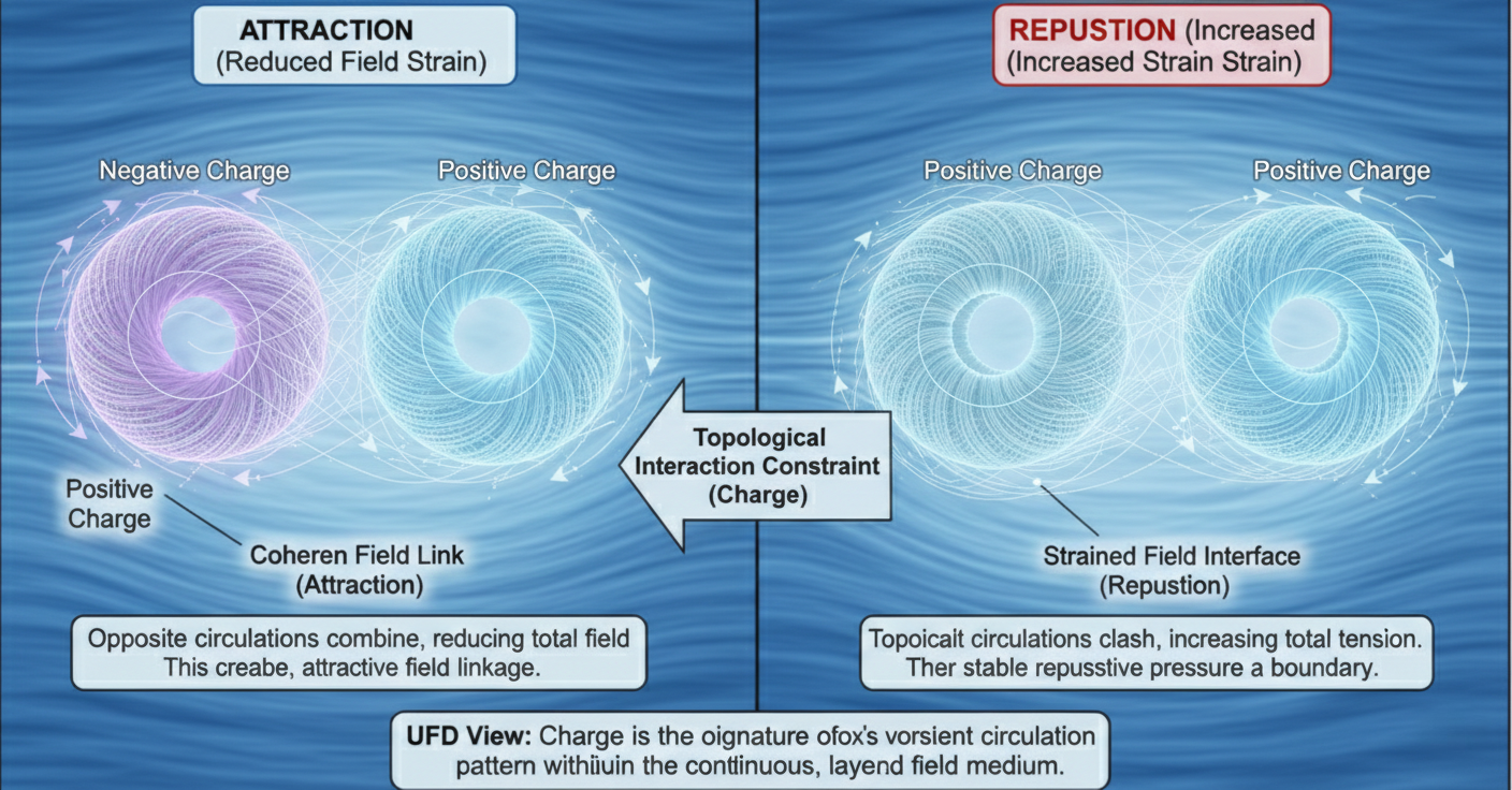 In UFD, charge is the net poloidal circulation pattern of a vortex in the Universal Light Field (ULF). The direction of circulation determines its sign. This circulation establishes a persistent polarization geometry in the surrounding ULF, which the incompressible Universal Energetic Field (UEF) stabilizes through pressure boundary conditions. Opposite circulations combine in a way that reduces total field strain, producing attraction; like circulations increase strain, producing repulsion. Charge is therefore not a label attached to matter — it is the outward signature of how a vortex circulates within layered media.
