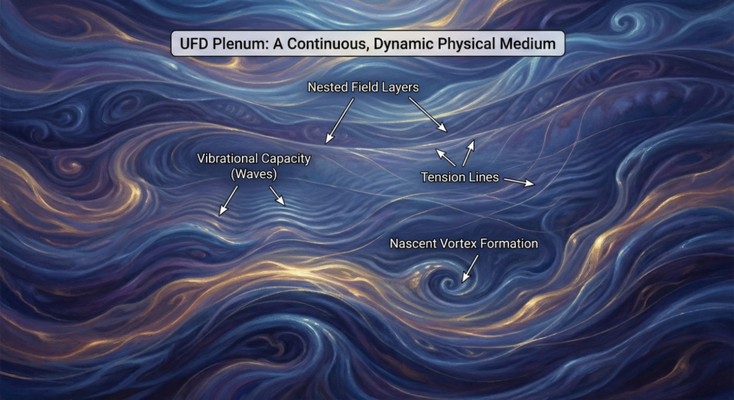 In Unified Field Dynamics, the plenum is the continuous, physically real substrate of the universe. It is not empty space and not merely a coordinate system. It is a structured, dynamic medium capable of sustaining pressure gradients, coherent circulation, resonance, and phase organization.