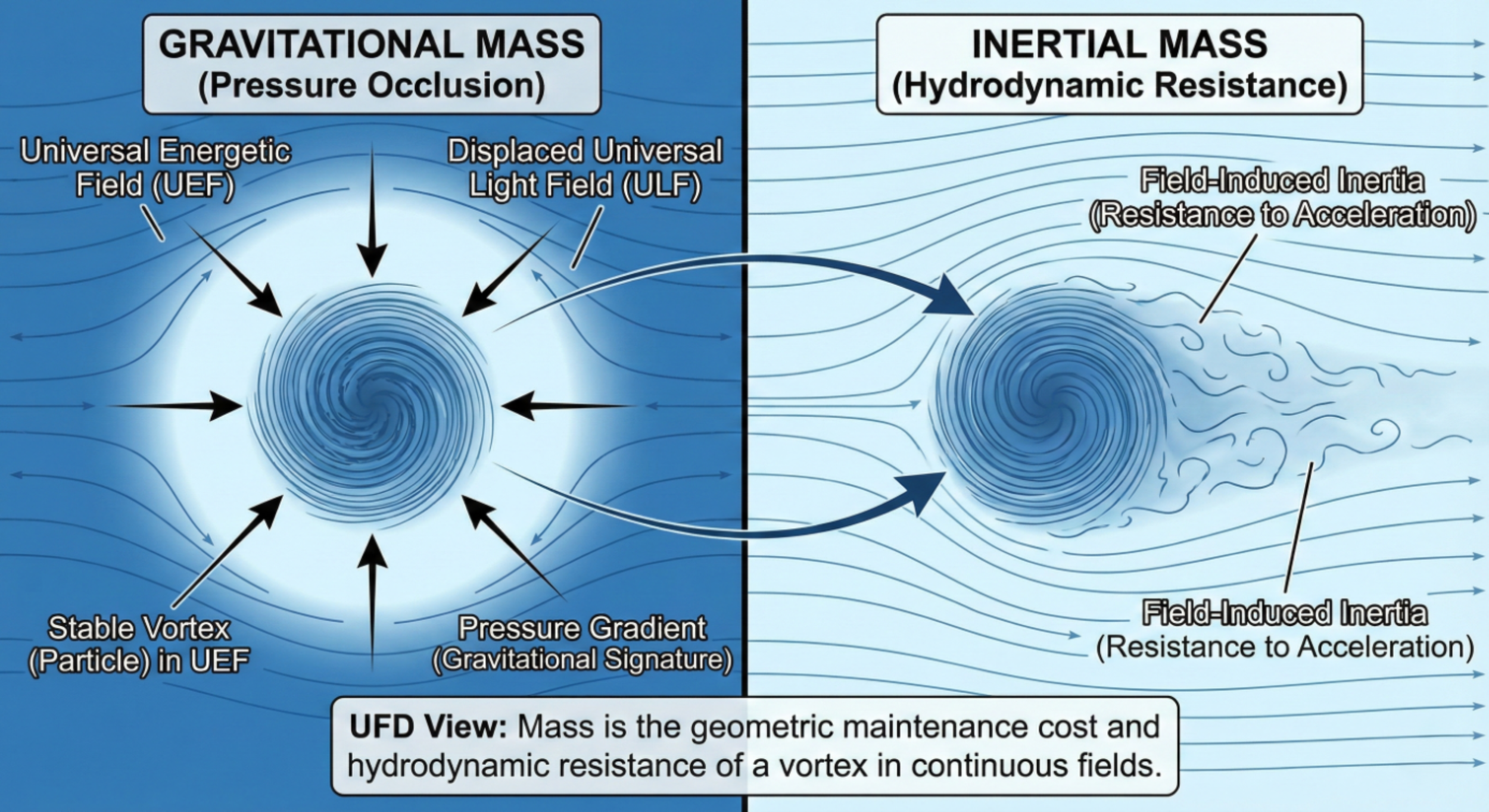 In UFD, mass is the geometric cost of sustaining a stable vortex within real fields. A circulating structure in the Universal Energetic Field (UEF) displaces and reorganizes the surrounding Universal Energetic Field (ULF), establishing a persistent pressure occlusion. That displacement requires energy to maintain and defines the structure’s gravitational signature. When the vortex accelerates, additional surrounding field volume must be rearranged, producing field-induced inertia. Mass is therefore not intrinsic substance — it is the maintenance energy and hydrodynamic resistance of a localized topology embedded in continuous media.
