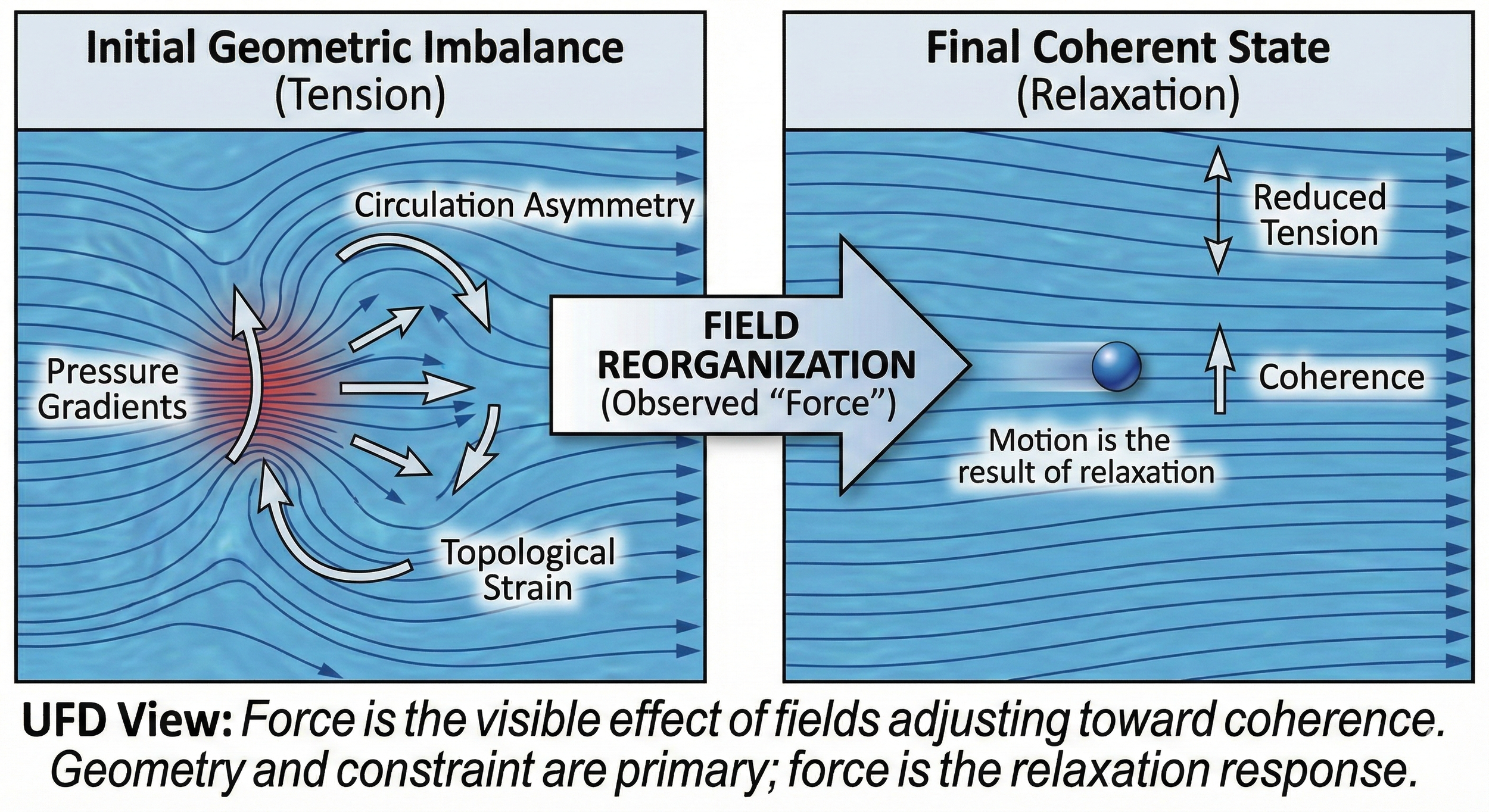 What we call a force is the visible effect of field reconfiguration under constraint. Geometry and boundary conditions are primary; force is the dynamic response of a tension-bearing medium.