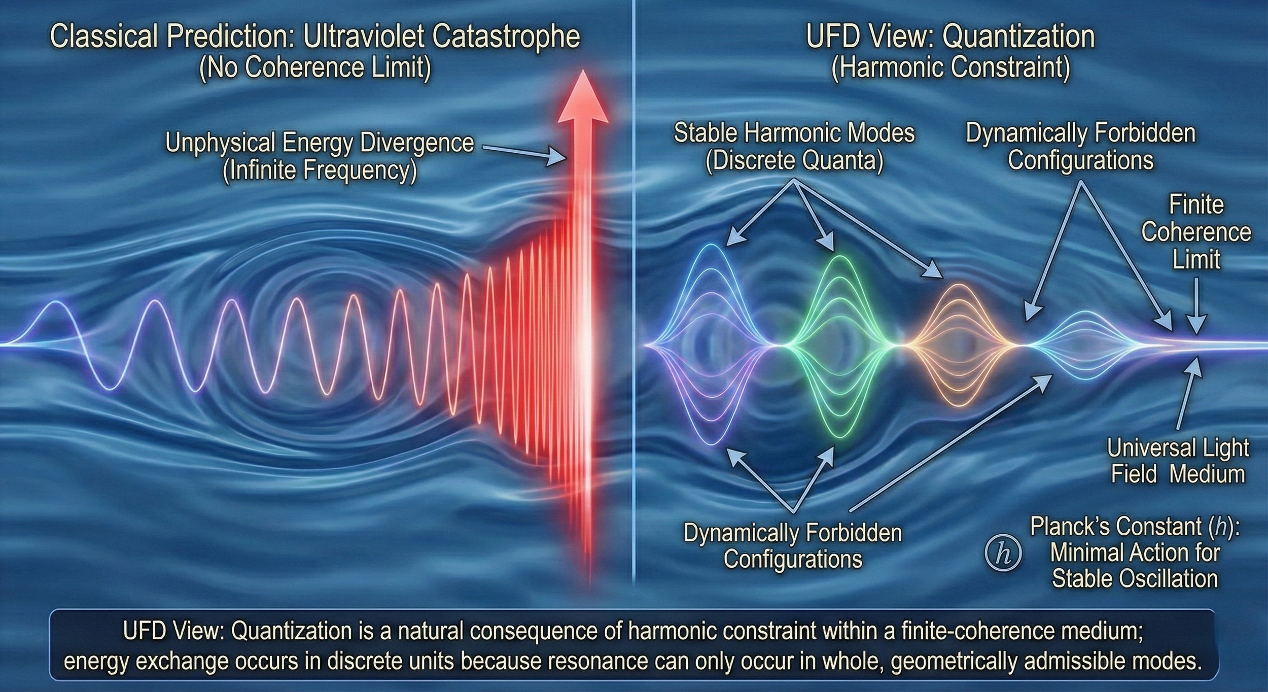 In UFD, quantization arises because only certain harmonic modes can be sustained within a structured medium. The ultraviolet catastrophe appears when one assumes that arbitrarily small wavelengths and arbitrarily large frequencies are physically admissible. However, a real field possesses finite coherence limits. Extremely high-frequency modes require geometric curvature and tension beyond what the medium can sustain, and such configurations are dynamically forbidden.