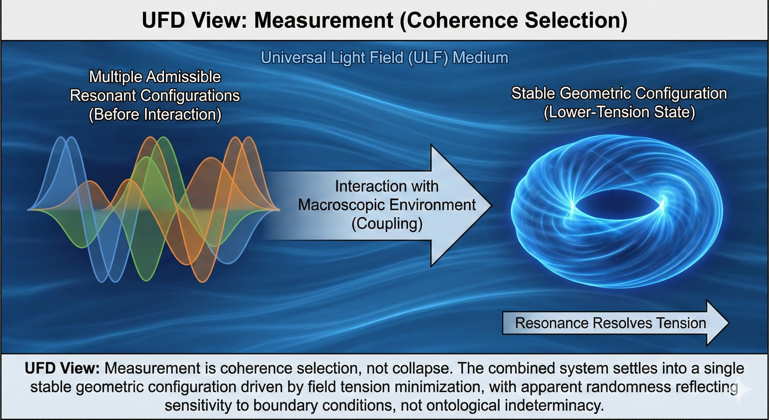 In UFD, measurement is coherence selection rather than collapse. When a quantum system interacts with a macroscopic environment, the combined system must settle into a single stable geometric configuration. The universal tendency of fields to minimize tension drives this stabilization process. Multiple admissible resonant configurations may exist prior to interaction, but only one can remain coherent once coupled to a larger structure.
