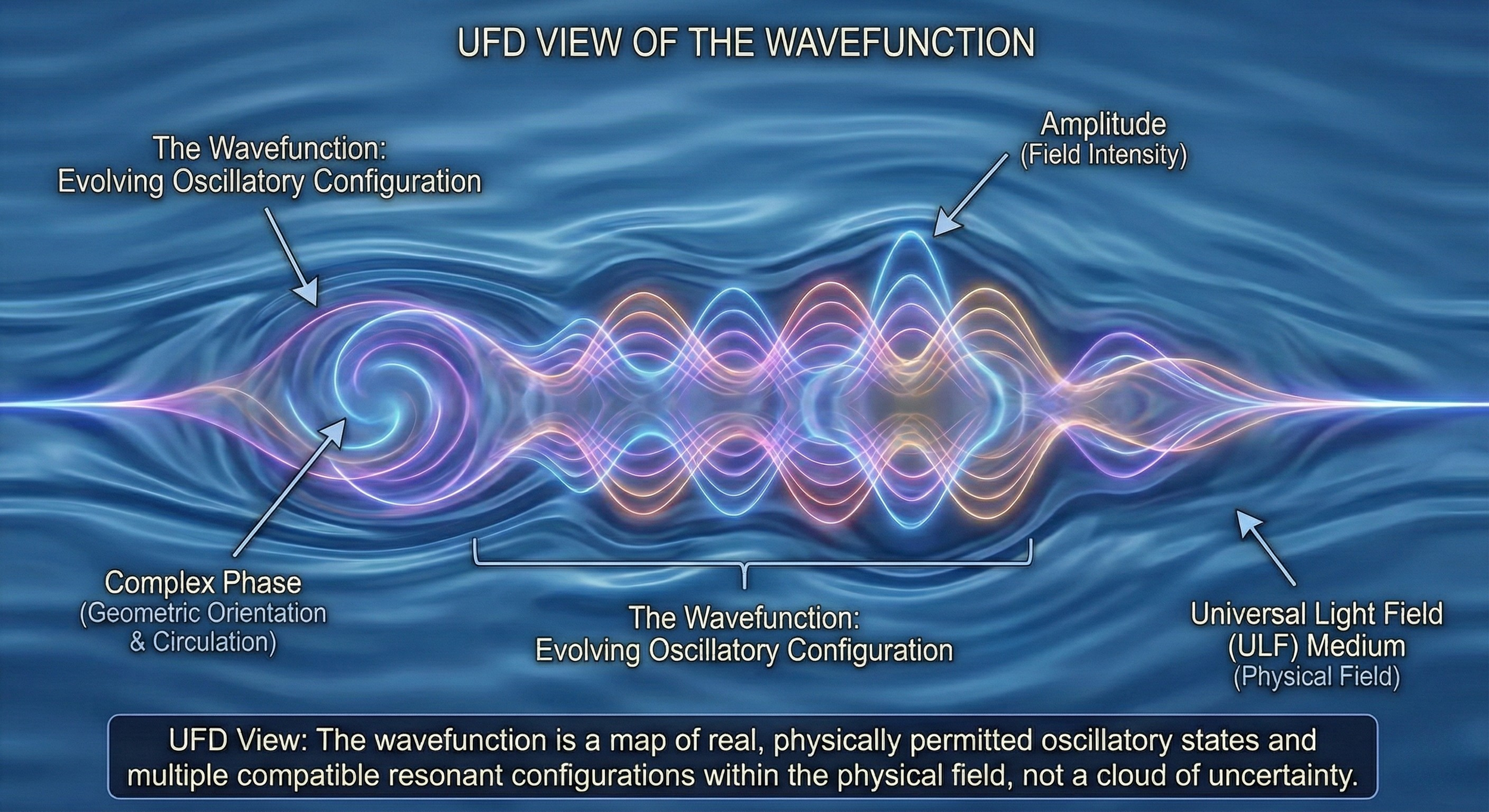 In Unified Field Dynamics, the wavefunction represents a real oscillatory configuration within a physical field. Its amplitude reflects the intensity of the underlying field disturbance, and its complex phase encodes geometric orientation and circulation within the medium. The mathematical formalism captures the harmonic structure of admissible field patterns rather than abstract probability amplitudes.