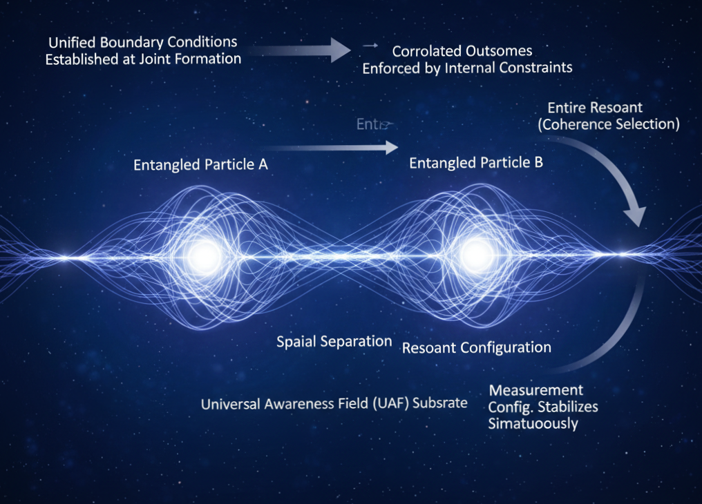This global coherence is supported by the deeper layer of the nested hierarchy, the Universal Awareness Field (UAF). The UAF does not transmit energy or signals between particles; rather, it is the substrate within which extended phase-locked configurations exist as unified objects. Because the entangled system is geometrically single, measurement does not send information from one particle to the other. Instead, the entire resonant configuration re-stabilizes simultaneously as one coherent entity. What appears as nonlocal influence is the lawful reconfiguration of a structure that was never divided in the first place.
