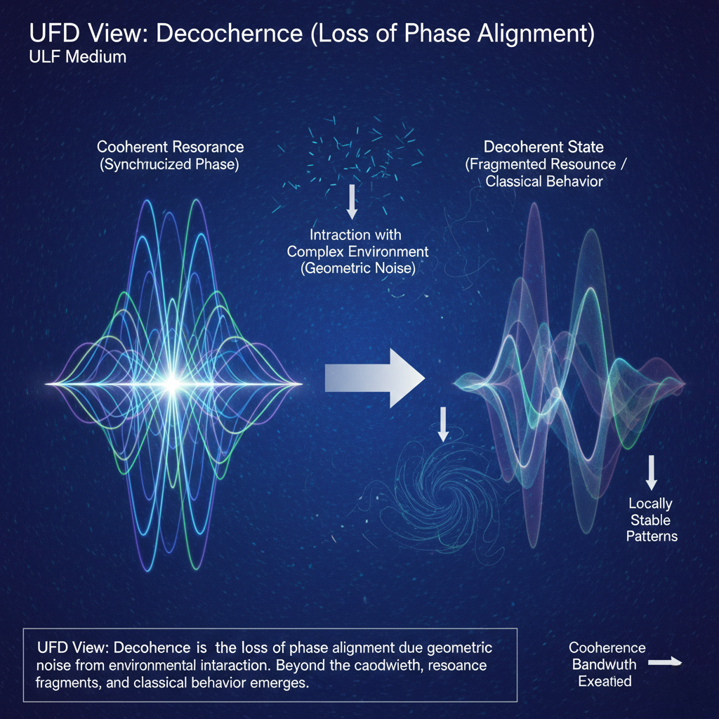 In UFD, decoherence is the loss of phase alignment within nested fields. Coherent resonance requires precise synchronization of oscillatory components. When a system interacts with a complex environment, geometric noise disrupts this alignment, and the field can no longer sustain unified oscillation.